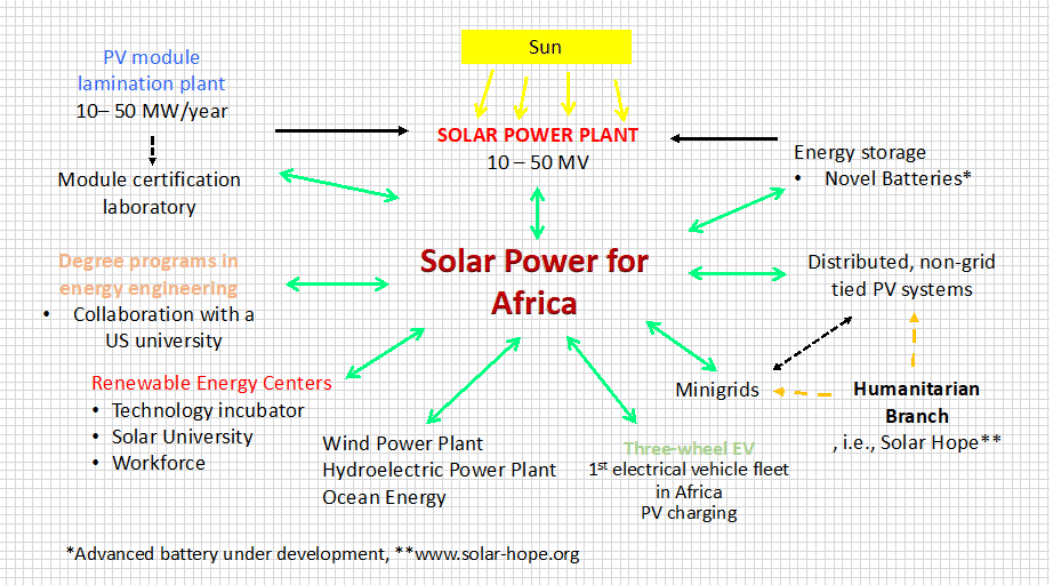 A comprehensive photovoltaic (PV) energy network is comprised of a PV module lamination assembly plant, large scale power generation plant, advanced battery storage, module certification laboratory, renewable energy center with technology incubator, small electrical vehicles (EV), solar energy universities, humanitarian effort, and implementing distributed solar PV installations with electrical microgrids and communication networks. The first target locations for this system are in African countries.